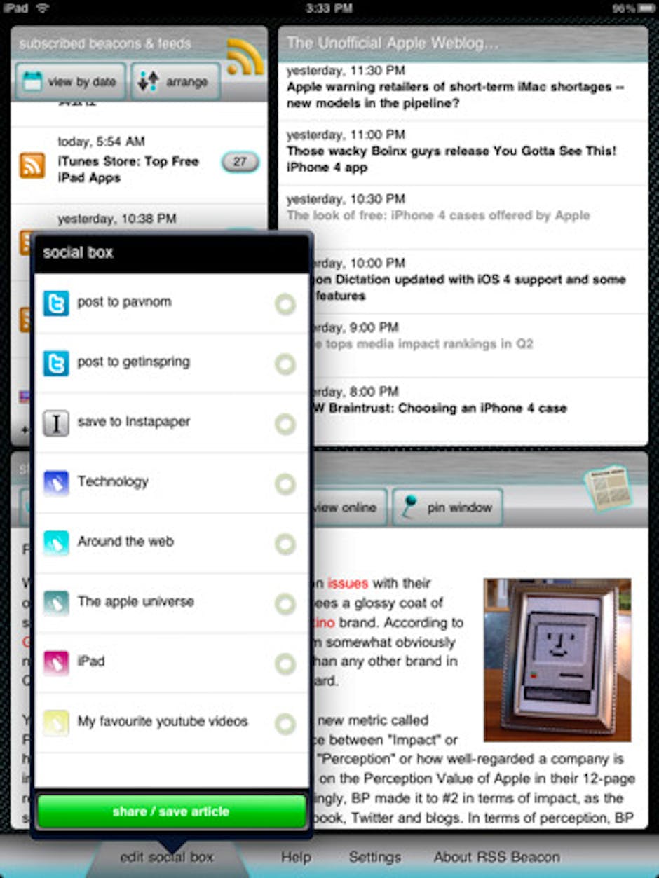 There has been a rash of iPad RSS reader apps recently trying to look like magazines or multimedia websites: Flipboard, FLUD, Apollo News and the rest. RSS Beacon…