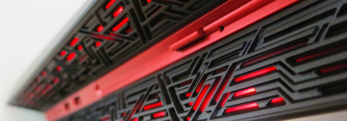 The black is accented by a mix of red plastic through the centre of the case and LEDs, which shine through a stylised set of grilles, supposedly inspired by Mayan markings. If you like a tower that has an element of showmanship about it, the LEDs fall into programmable ‘zones’, each of which supports eight million colour options and what’s more, they pulse or ‘breathe’ when left to idle.